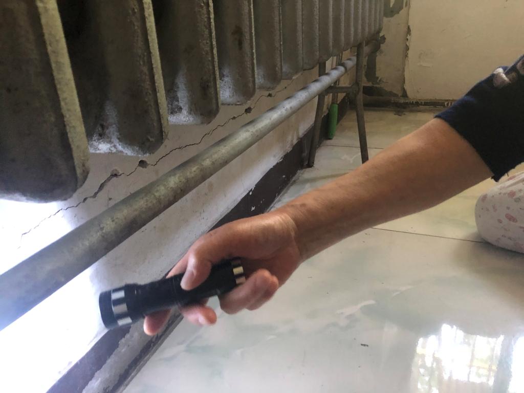 “你看这是我做的记号。”张女士指着墙角的一道较大的裂纹让记者看,这道裂纹的“半腰”处,有一道白色的痕迹,张女士说她发现这道裂纹时,就在裂纹的顶部做了个记号,可没过多久这道裂纹又长了一倍。从这道裂纹里,记者已经能看到红砖。