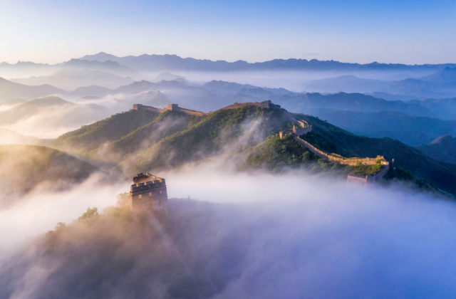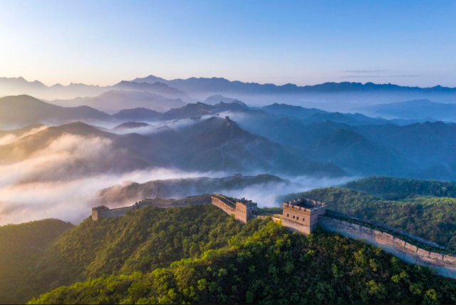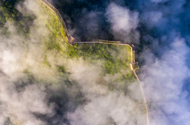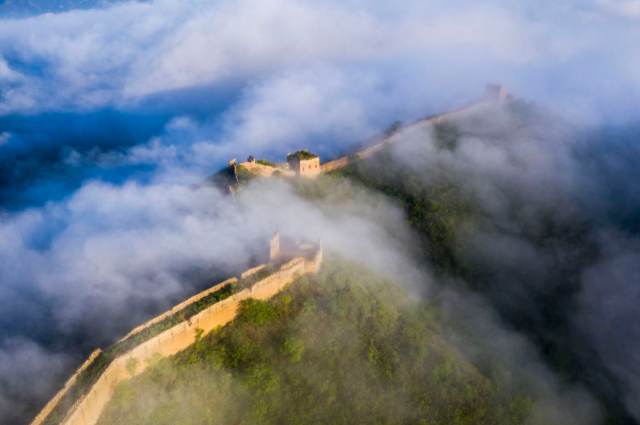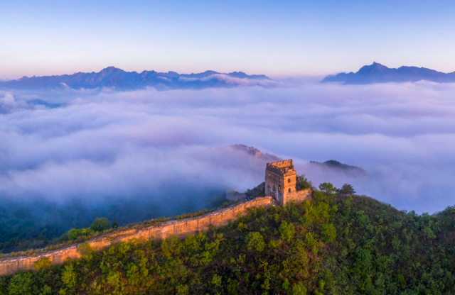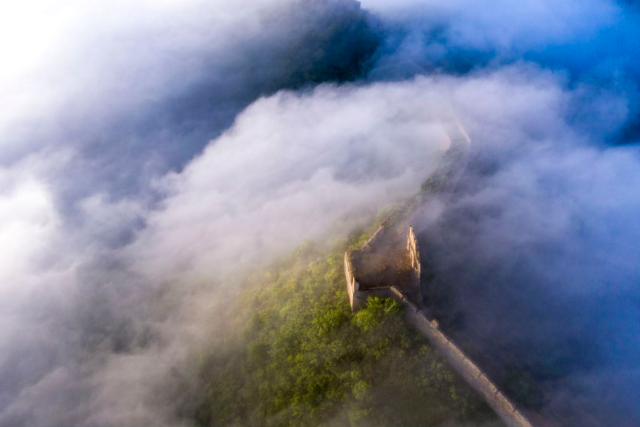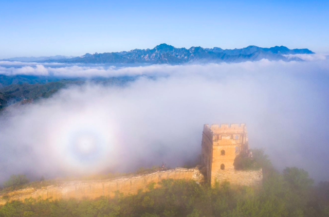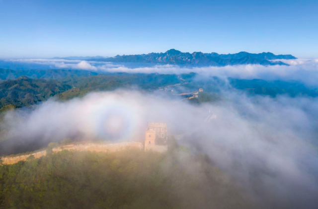 6月1日清晨,历经了一夜的雨,密云区古北口蟠龙山长城惊现云海奇观。连绵的云海掩映着蟠龙山长城,并骤然幻化出一个红、橙、黄、绿、青、蓝、紫的七色光环,中央虚明如镜,实为难得一见的绝色美景。