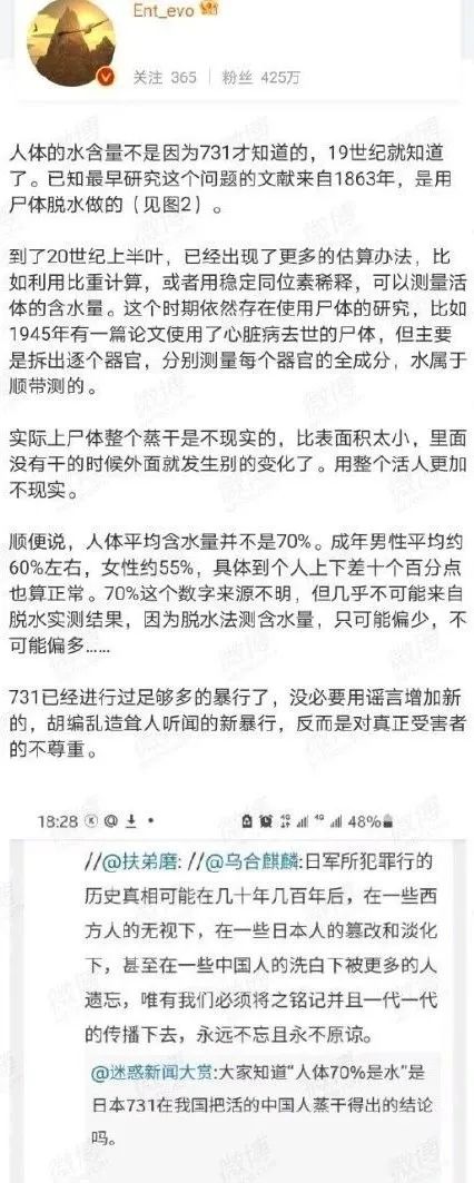 当天,一名拥有425万微博粉丝的科普大V、科学松鼠会成员@Ent_evo 发文,一本正经地“辟谣”称“把活人蒸干测量含水量不现实”,声称“没必要用谣言为731部队增加新的暴行”。