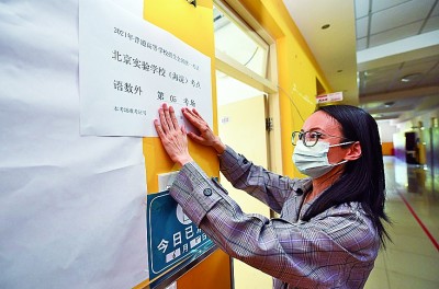 6月5日,在北京实验学校(海淀)考点,工作人员张贴考场信息。新华社发