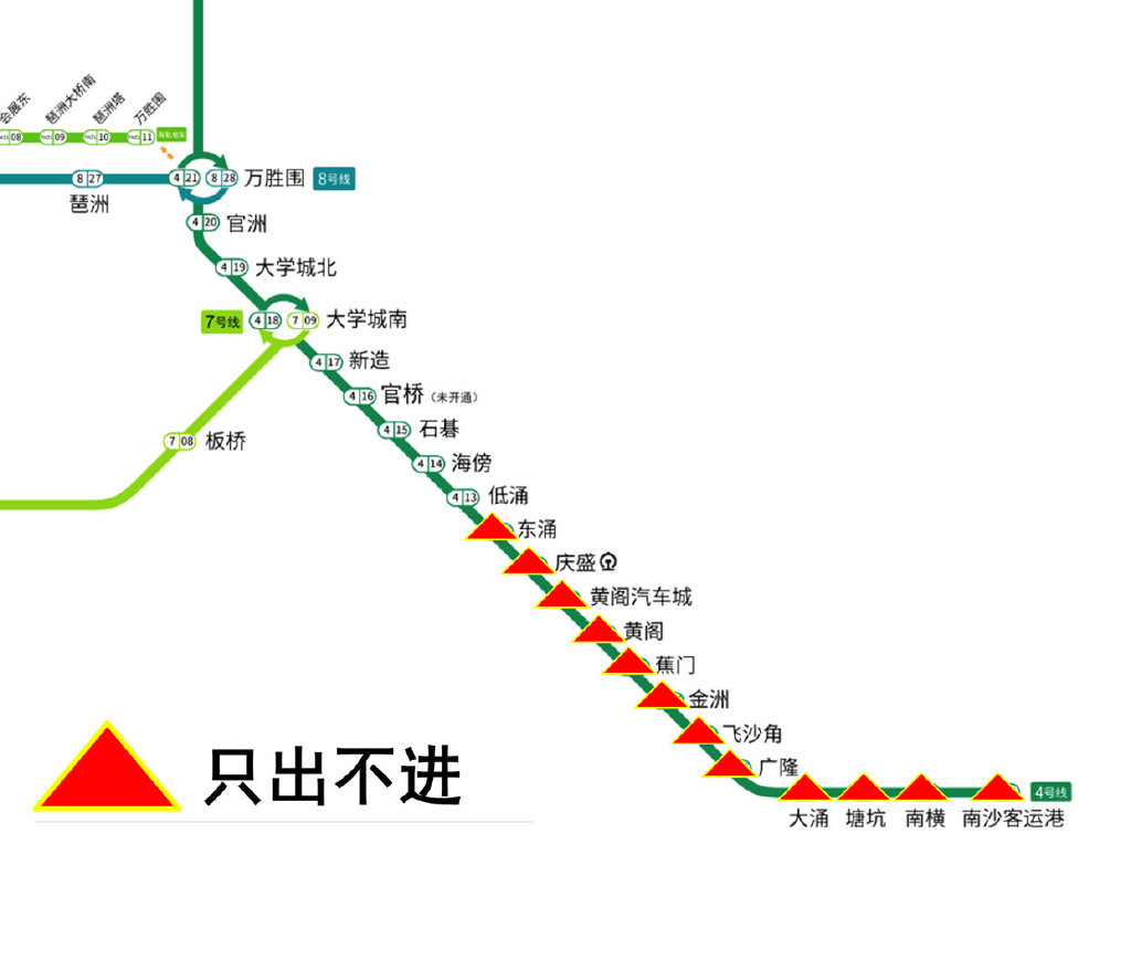 根据上级最新通知,6月7日运营时间起,一号线西塱站、坑口站、花地湾站、芳村站,广佛线龙溪站、西塱站、沙涌站,五号线滘口站调整为停止对外运营服务;广佛线鹤洞站、菊树站仍实行停止对外运营服务;四号线“东涌站至南沙客运港站”各站所有出入口只出不进。感谢您的谅解与合作。