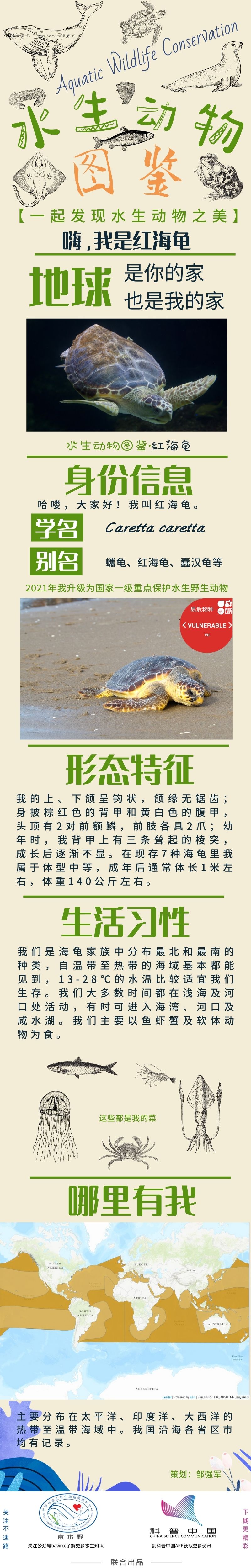 红海龟幼年时,背甲上有三条耸起的棱突,成长后逐渐不显。在现存7种海龟中属于体型中等,是海龟家族中分布最北和最南的种类,自温带至热带的海域基本都能见到。