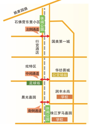 在相关部门的通力合作下,两条人行通道已于去年10月率先取得方案批复。棘手的是位于最南侧的人行通道。因涉及周边现有公园、垃圾楼、铁路建筑及规划道路,建设条件受限,方案设计难度较大。
