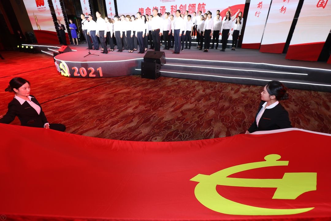 智能机器人在人群中穿梭迎宾;LED编程的一面面电子旗帜在舞台上闪耀;台上嘉宾启动光柱、台下观众手机扫描能量条递进,全场人员共同启动现场仪式……6月8日,中关村科学城创新合伙人党建联合会成立大会及“使命传承 科创领航”庆祝建党100周年主题活动举行,高科技元素无处不在。