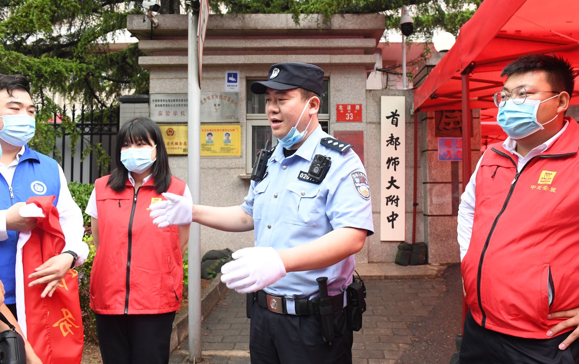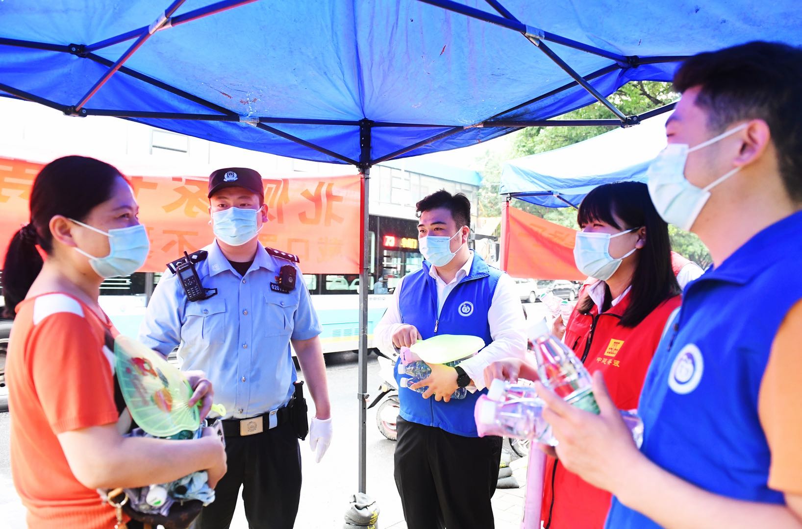 自高考第一天开始,来自恩济庄派出所、街道机关、社区、驻区企事业单位的青年志愿者们就坚守在这里,协助指挥交通、维护秩序、分发解暑物品……“青春蓝”们为高考学子和家长们提供各种暖心服务,帮助家长缓解焦虑的等待情绪,成为考生和家长们最坚强的“暖心后援会”。