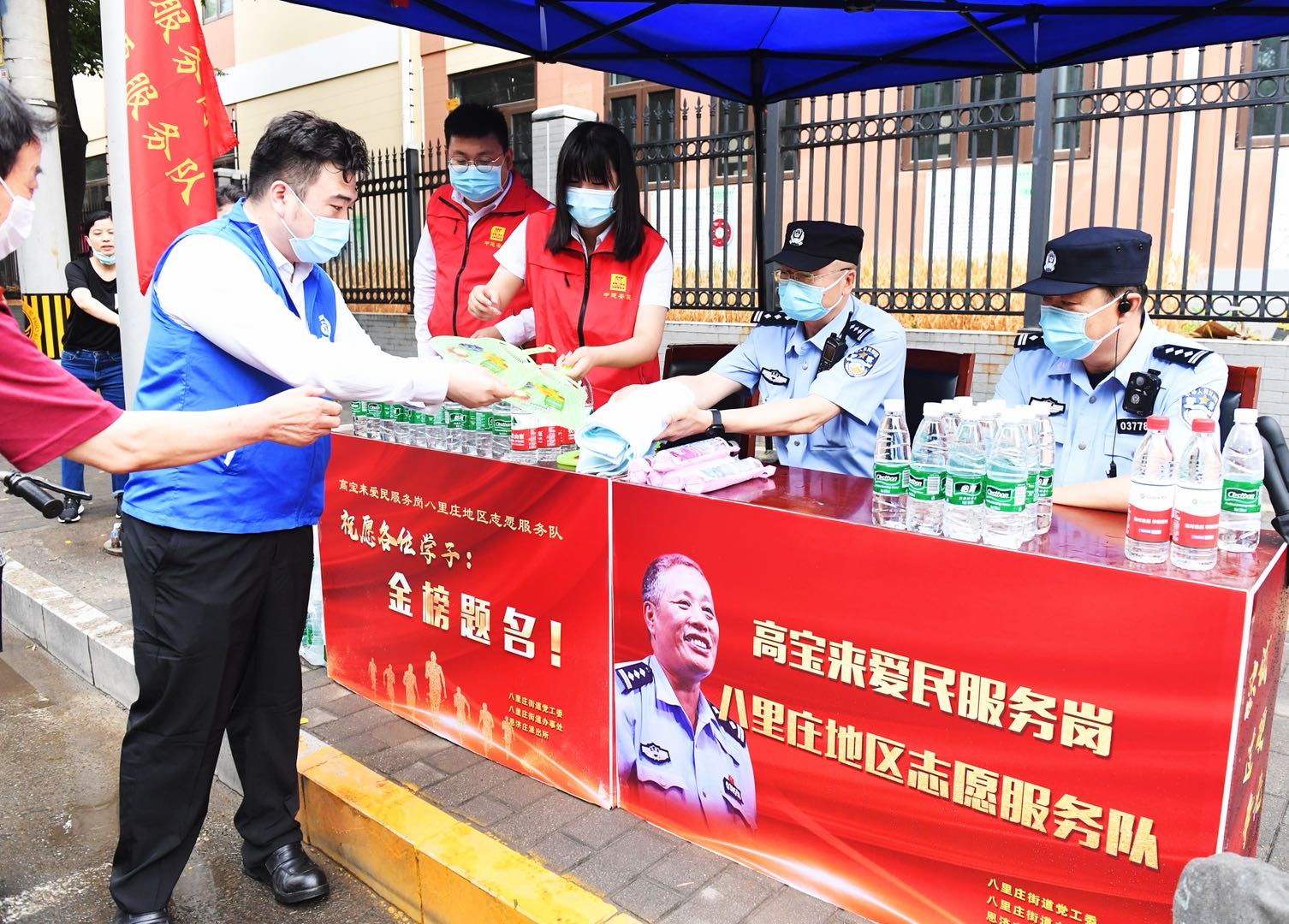 “下雨了,送您把伞。”6月9日下午,在八里庄地区高考考点首都师范大学附属中学考点大门外,“高宝来爱民服务岗八里庄地区志愿服务队”服务台醒目树立,矿泉水、扇子、小毛巾等保障物资一应俱全。