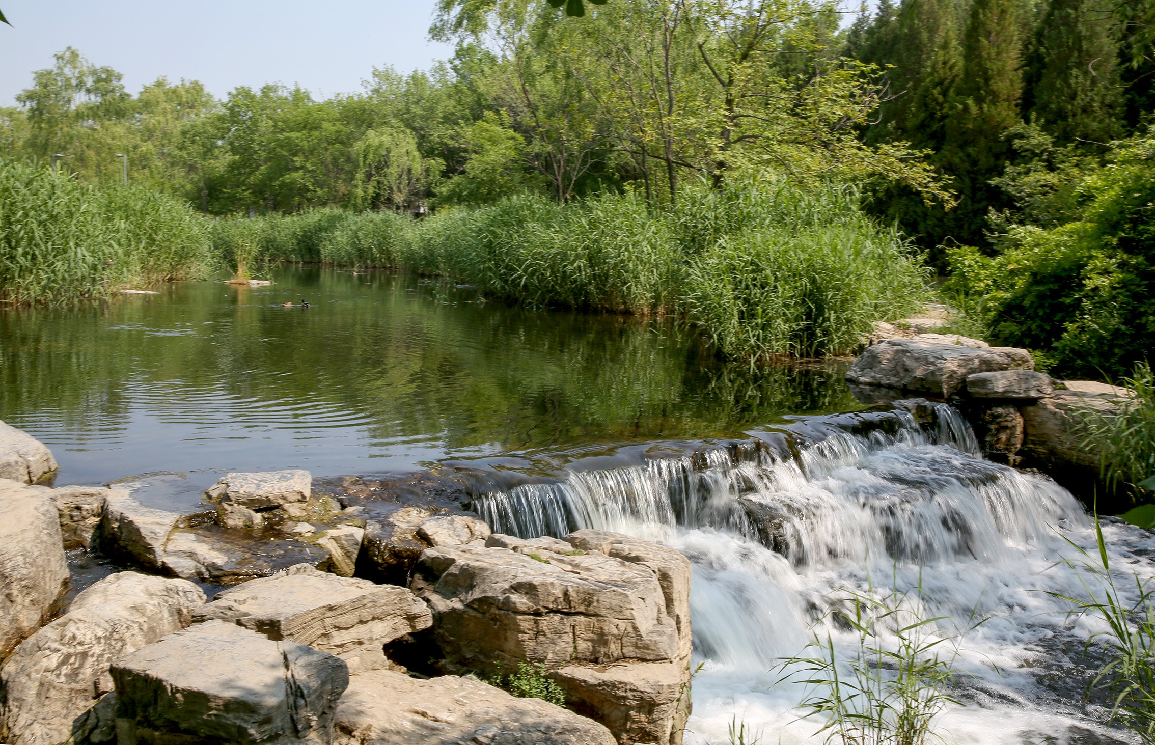 奥森南园中,奥海湿地面积约10公顷。芦苇翠绿茂盛,足有一人高,水鸟嬉戏其间,鸟鸣不绝于耳。