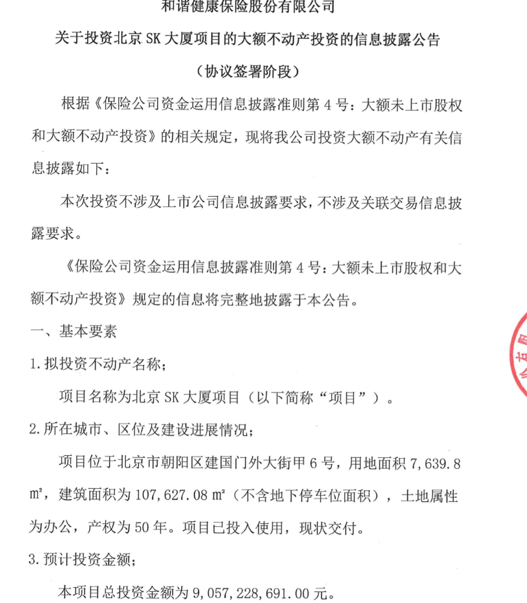 根据和谐健康保险公司信息公告所披露,公司采用股权购买方式,出资约90.57亿元收购北京新锦城房地产经营管理有限公司100%股权,从而持有北京SK大厦。此次投资的资金来源为保险责任准备金,均为传统险账户出资。