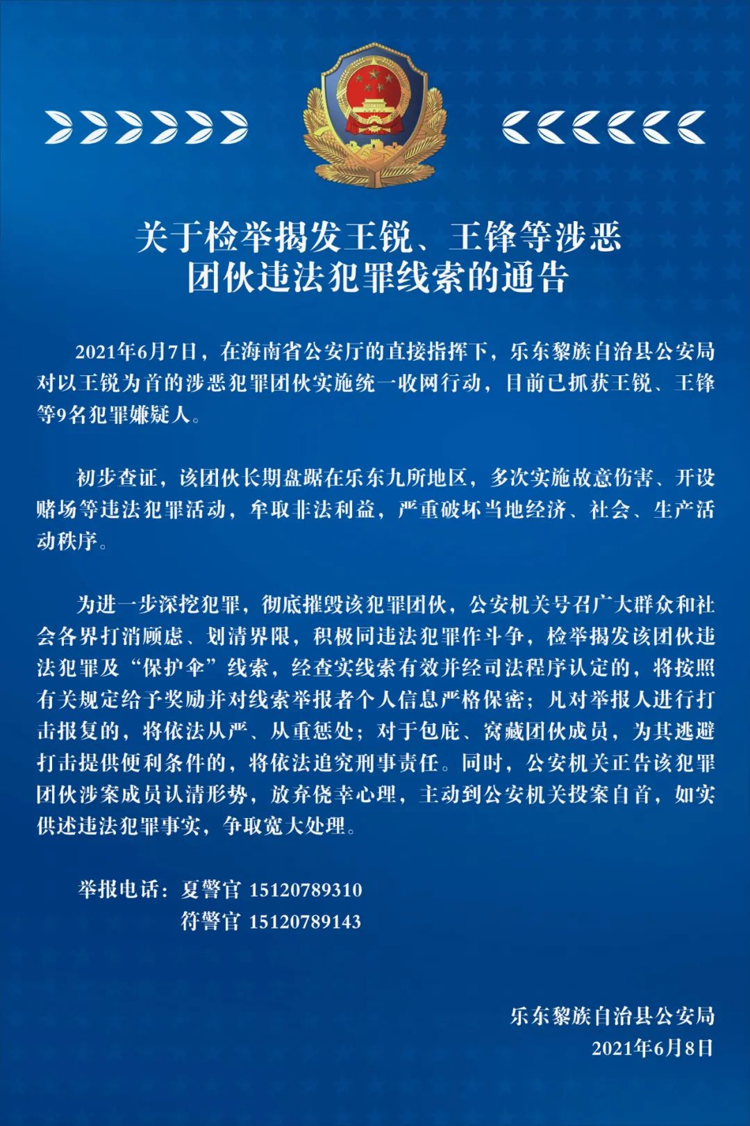 2021年6月7日,在海南省公安厅的直接指挥下,乐东黎族自治县公安局对以王锐为首的涉恶犯罪团伙实施统一收网行动,目前已抓获王锐、王锋等9名犯罪嫌疑人。