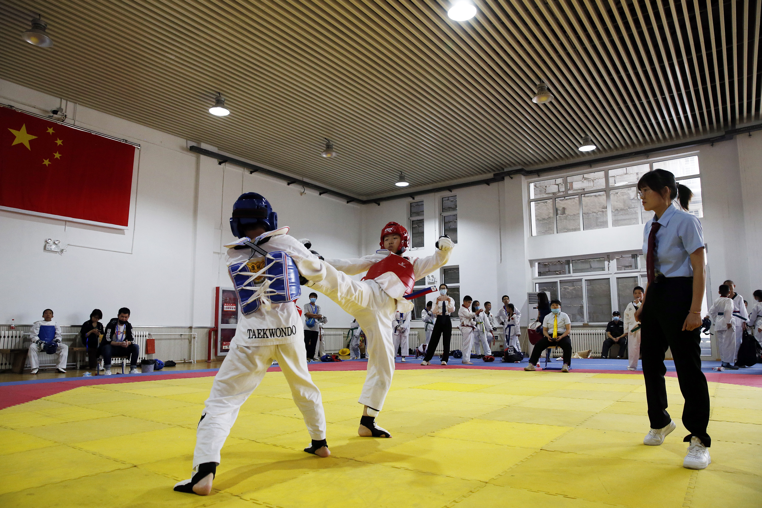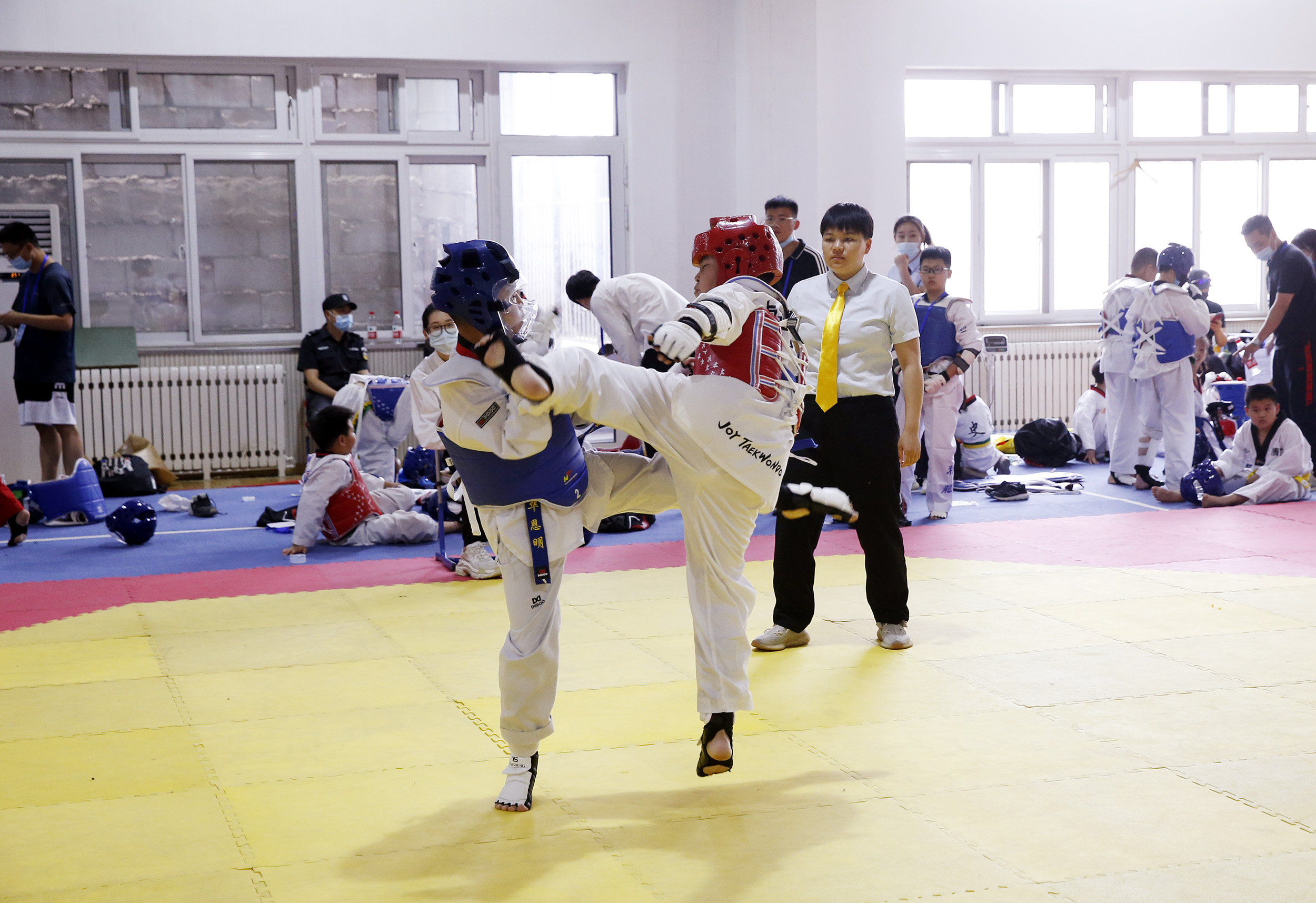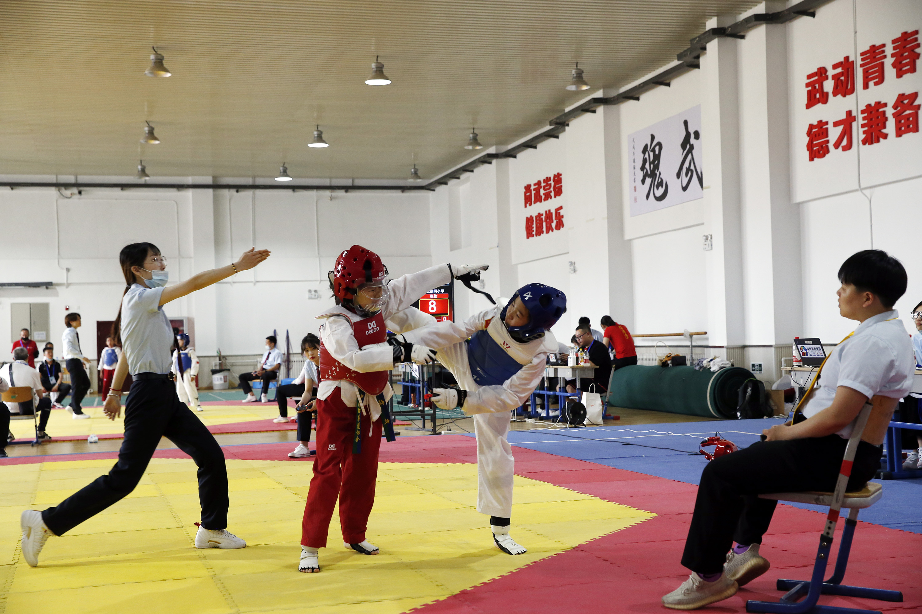 6月11日,阳光体育“府学杯”北京市东城区中小学生跆拳道比赛在地坛体育中心武术馆拉开战幕。比赛由东城区教委、东城区体育局主办,来自东城区5所中学、21所小学共计200多名中小学生参加了个人品势、团体品势项目和竞技项目比赛。