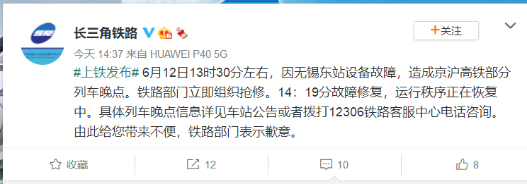 据@长三角铁路 消息,6月12日13时30分左右,因无锡东站设备故障,造成京沪高铁部分列车晚点。铁路部门立即组织抢修。14:19分故障修复,运行秩序正在恢复中。具体列车晚点信息详见车站公告或者拨打12306铁路客服中心电话咨询。由此给您带来不便,铁路部门表示歉意。