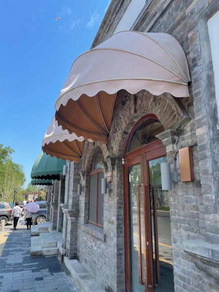 与鼓楼西大街的“短而静”相比,东四南、北大街路边有公交车站,下方管线复杂。考虑到树木占地以及根系延伸,并非所有路侧位置都能补植树木。近张自忠路地铁站东北角时,一段较为狭窄的人行道边就无法种植行道树,却并不觉得十分炙晒,奥秘即来自临街房屋门、窗上方安装的一些半圆形雨棚。“我们戏称它们为‘雨眉毛’,可以尽量起到遮阳挡雨的作用。”