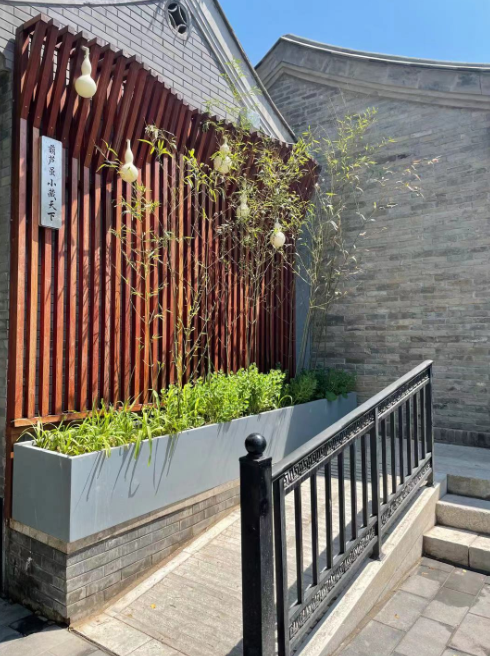 在位于东四北大街126号的稻香村门前空地,此前栽下的爬藤植物已从两侧攀上特别设计搭建的廊架。待再茂盛一些,于廊架顶部合龙,即可收获一座绿色“拱门”。