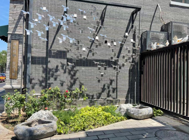 一排竹子栽种于细长花箱内,其间点缀着四五个葫芦,被木栅栏映衬得古色古香,一旁有字云“葫芦虽小藏天下”;花草丛中,“飞”出亮闪闪的群鸽,就连栏杆上也落着几羽白鸽,绑着的鸽哨栩栩如生,此处有题“风吹哨响,群鸽飞舞”……记者注意到,东四北大街的临街房屋侧面,不乏此类与绿化共同搭建形成的立体小景,彰显浓郁本地特色。玩味细品间,令人会心一笑。