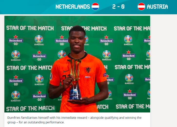全场比赛,打满90分钟的邓弗里斯打入一球、制造一个点球,连续两场比赛被评为最佳球员。赛后,带着最佳球员奖杯出席发布会的邓弗里斯露出了憨厚的笑容,他说:“这两场比赛我都尝试着通过前压覆盖空间,我们也打进了5个精彩的进球。”在接受荷兰国家电视台采访时,邓弗里斯表达了和球队一起前进的决心,“这个三分很重要,我们在本届欧锦赛上的开局真的很不错,现在该向更远的目标努力了。”