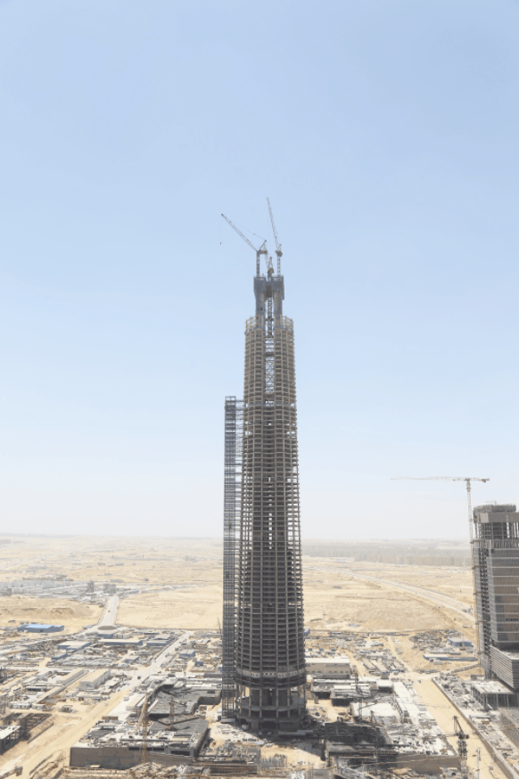 埃及新行政首都CBD标志塔项目于2018年5月2日动工,是一个集办公、酒店、商业、观光等功能于一体的复合业态超高层建筑。项目总占地面积6.5万平方米,建筑面积26.2万平方米,地下2层,地上78层,结构高度373.2米,塔冠最高点385.8米,被誉为“非洲第一高楼”。