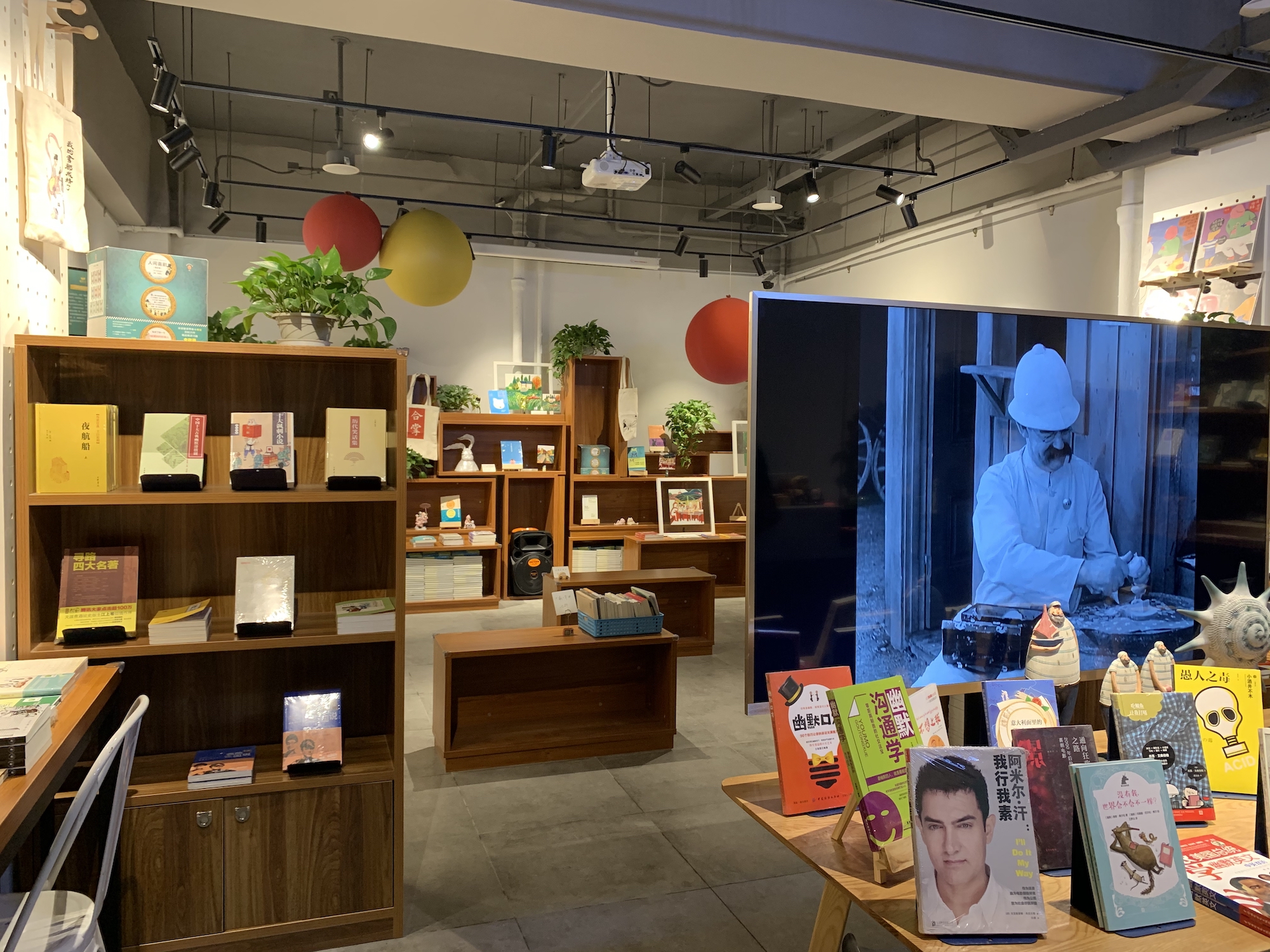 再往里走,是图书阅读空间,电视屏幕上正在播放卓别林经典电影《城市之光》片段,卓别林和满屋的图书、漫画融为一体,仿佛跨越时空,也成了幽默书店的一员。