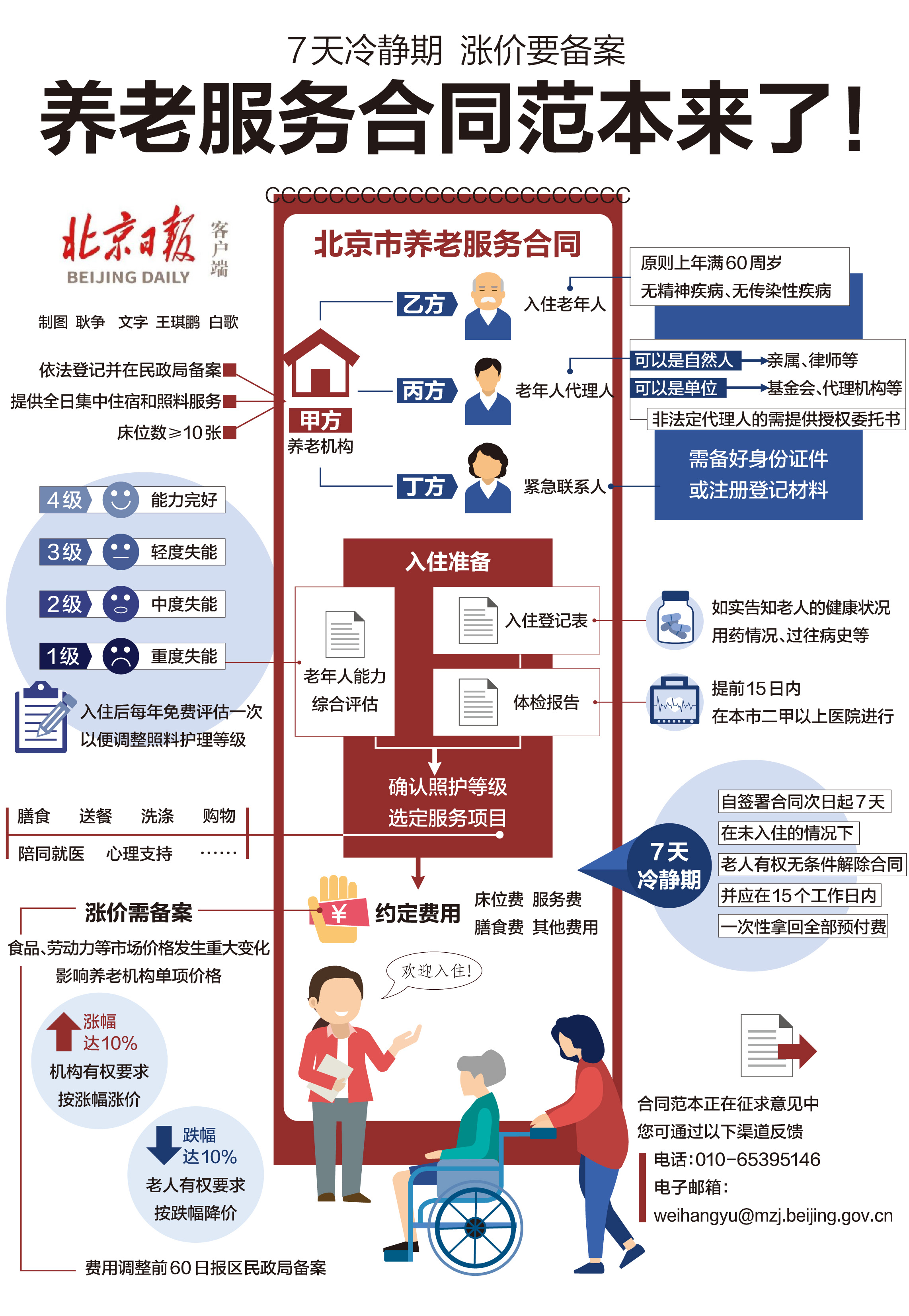 入住咱北京的养老机构得提供哪些材料?照料级别能不能随心选择?住进去后随意涨价怎么办?《北京市养老服务合同示范文本》正在公开征求意见,该征求意见稿提出设立“7天冷静期”,还对养老机构的入住条件及程序、服务内容与质量标准等进行了规范引导。