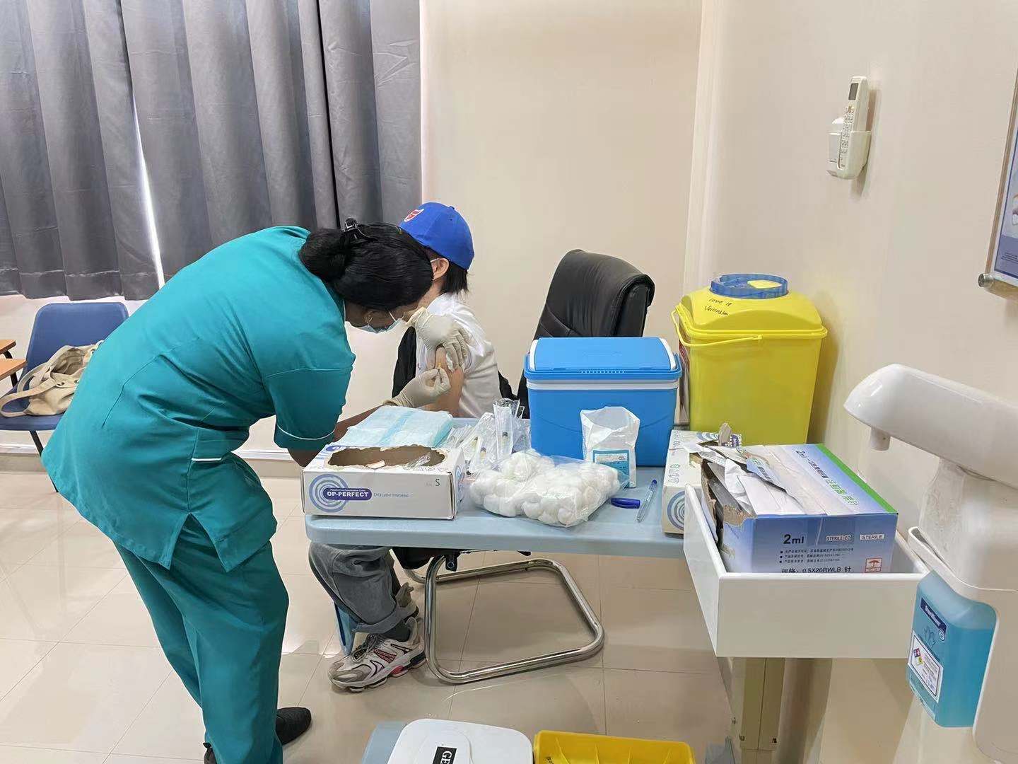 6月22日,阿曼医护人员为中国侨胞接种第二剂疫苗。
