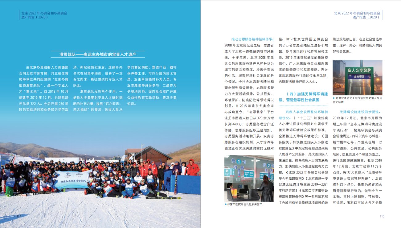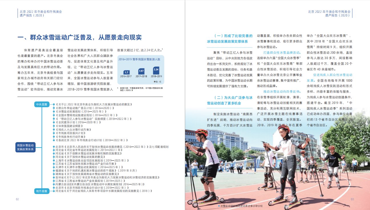 为系统总结北京冬奥会遗产成果,北京冬奥组委会同北京体育大学编制完成了《北京2022年冬奥会和冬残奥会遗产报告(2020)》中文版和国际版。报告以图、文和专栏的形式总结提炼了北京冬奥会自2015年申办成功以来筹办工作所形成的遗产成果,重点呈现了促进中国冰雪运动普及发展,超前谋划场馆赛后利用,持续提升京张地区生态环境,促进京津冀地区协调发展,主办城市转型发展,引领社会文明进步。