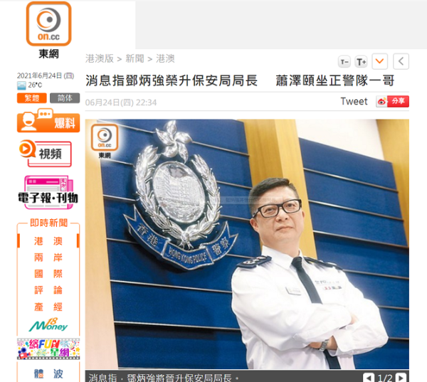据香港“东网”刚刚消息,香港警队“一哥”、现任警务处处长邓炳强将接替李家超保安局局长一职。