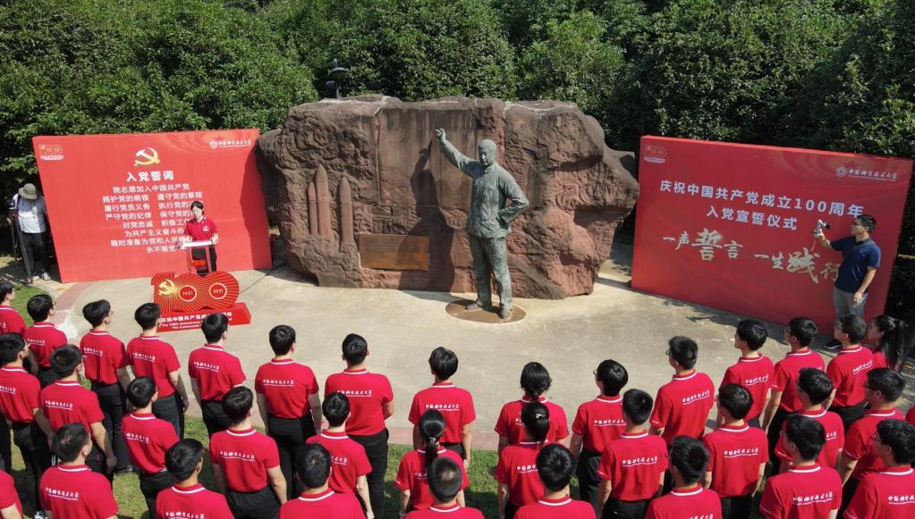 6月22日上午,中国科学技术大学钱学森塑像前,88名大学生举起右拳,在党旗下庄严宣誓。