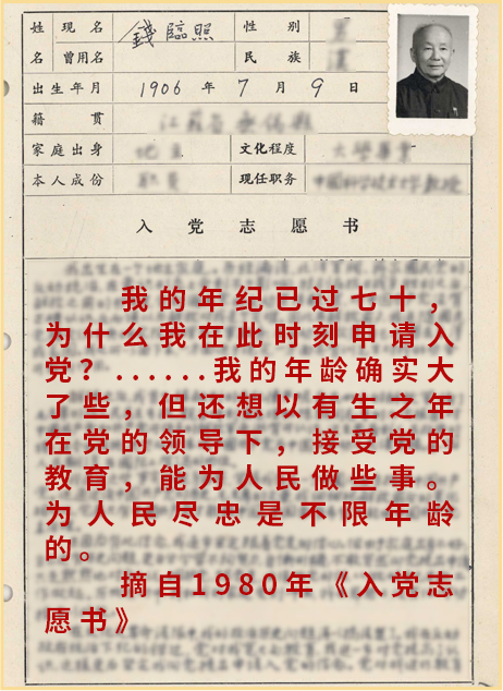 他在《入党志愿书》中写道:“我回国近三年来受到党的教育……使我体会到党的伟大,党为实现共产主义社会这一目标的伟大,我愿为这一目标奋斗并忠诚于党的事业。”
