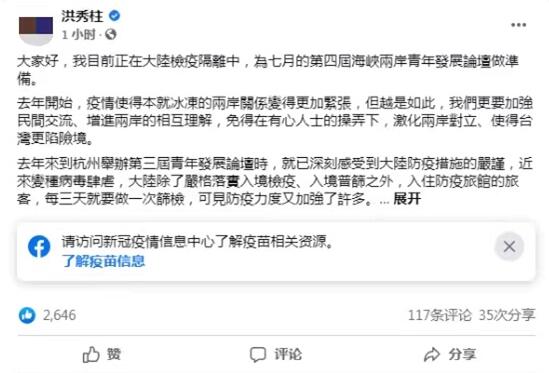 洪秀柱提到,“今天已经是入境检疫隔离的第五日,这几天,除了吃喝追剧、放松休息之外,也持续不辍的关心台湾新闻。自从5月台湾疫情暴发之后,我曾率先表达愿意向大陆争取疫苗,大陆也表示愿捐助医疗设备及疫苗,我们非常感谢所有愿意对台湾伸出援手的善意与关怀”。
