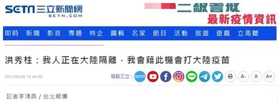 报道最后提到,洪秀柱表示,有些朋友关心她会不会在大陆接种疫苗,“当然,我会借此机会在大陆接种通过WHO认证的疫苗,我对大陆的疫苗质量也有信心。希望台湾的疫情能够尽快获得有效的控制,也祝福大家健康、平安”。