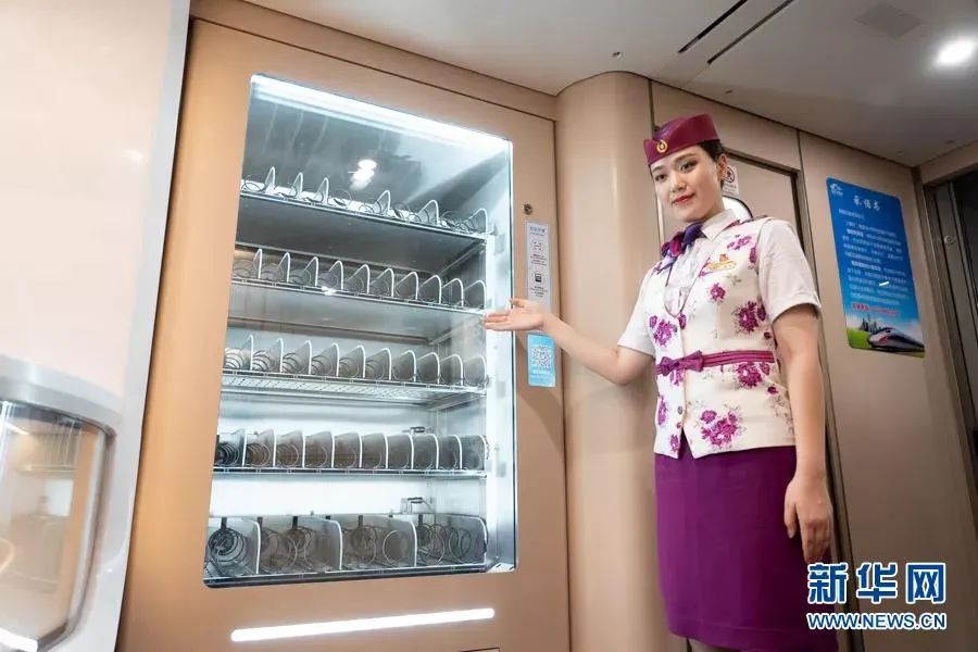 “复兴号”智能动车组车厢连接处布局的自动贩售机。新华网 耿骏宇 摄
