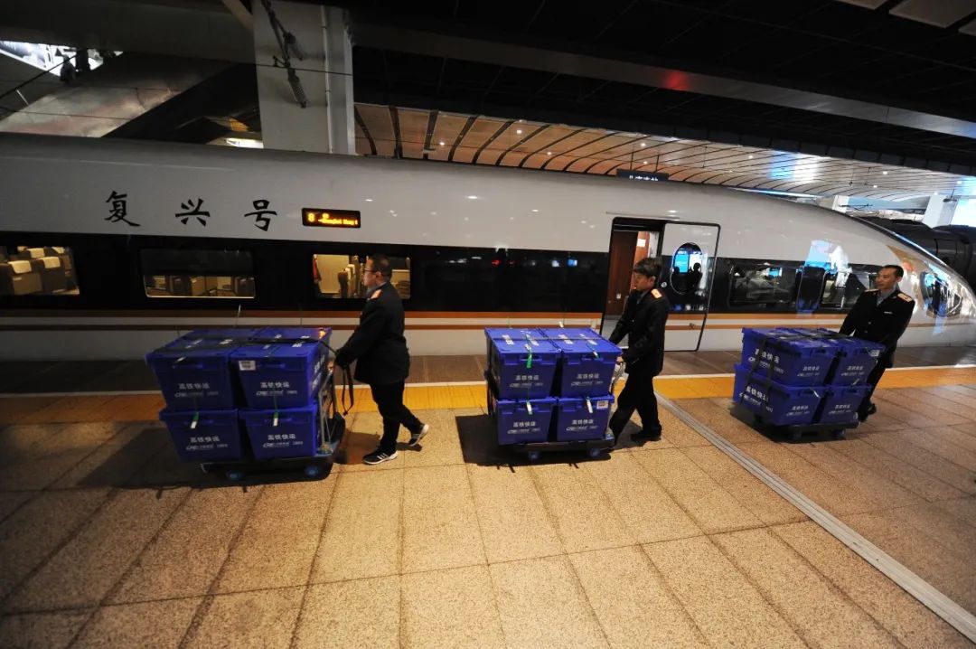 2017年11月9日,北京南站,“高铁极速达”快运试运营,工作人员将快运柜推上站台。自11月11日起至20日,铁路部门在京沪高铁“复兴号”列车上推出“高铁极速达”快运新产品,实现10小时货物送达客户。(图片来源:视觉中国)