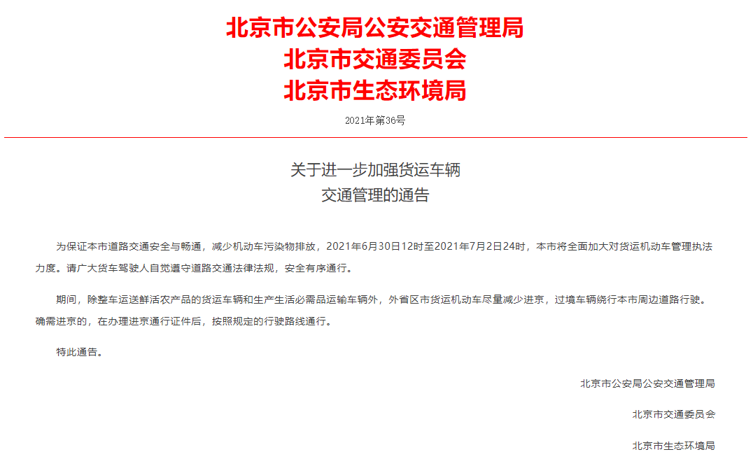 北京市交管局官网发布通告,2021年6月30日12时至2021年7月2日24时,北京市将全面加大对货运机动车管理执法力度。期间,除整车运送鲜活农产品的货运车辆和生产生活必需品运输车辆外,外省区市货运机动车尽量减少进京,过境车辆绕行本市周边道路行驶。确需进京的,在办理进京通行证件后,按照规定的行驶路线通行。