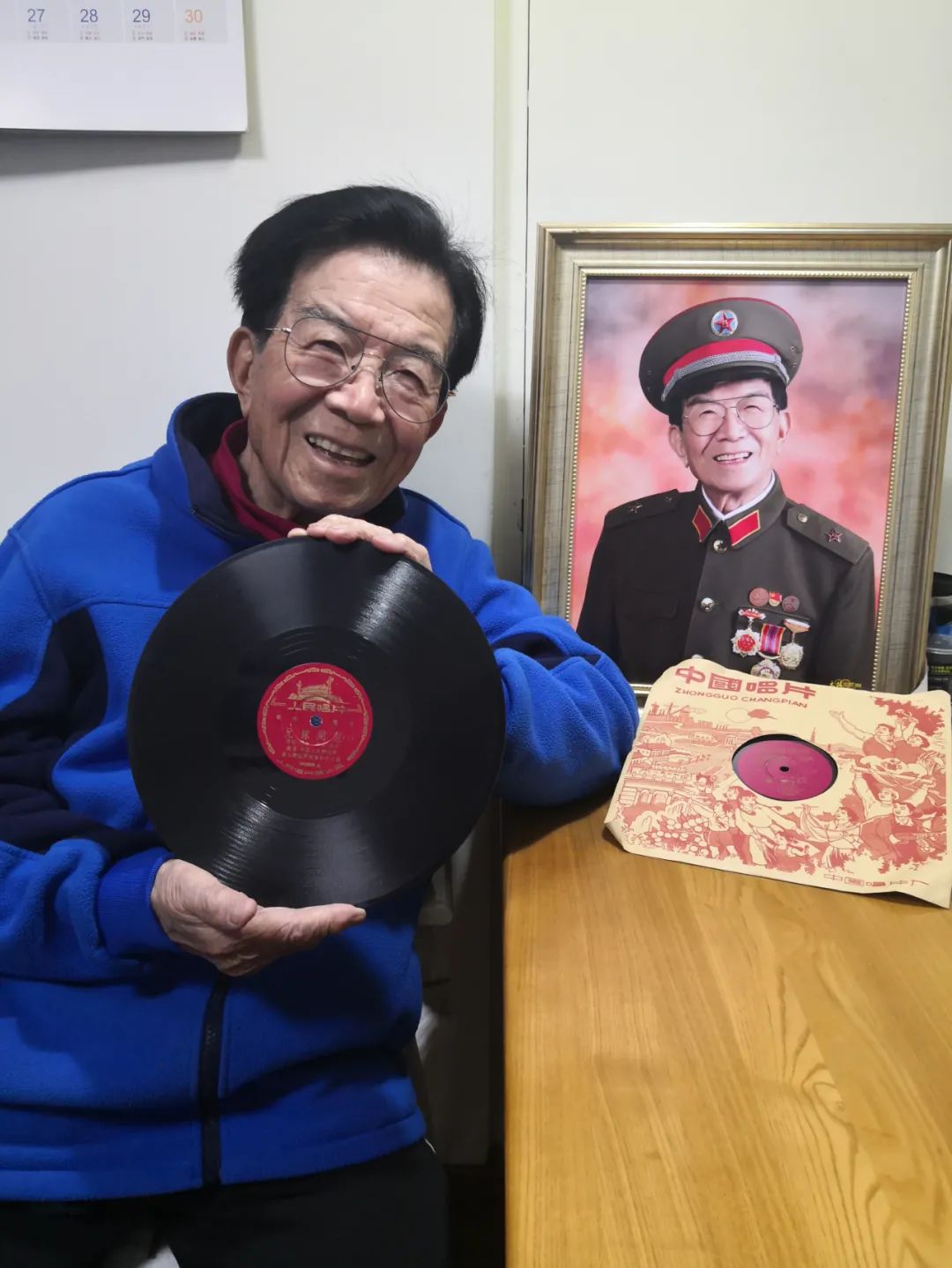 彭彬拿着收录有他1949年6月演唱《兄妹开荒》选段“向劳动英雄看齐”的唱片