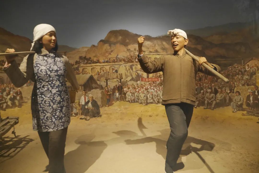 展线中,《兄妹开荒》情景雕塑还原了当年的演出现场,裹着白头巾穿着陕北农民服装的王大化、李波扛着锄头,挑着担子放声高歌。背景中观看演出的八路军官兵中,还仿佛看到了毛主席等中共中央领导人的身影。窑洞顶和远处的山坡上挤满了观众,再现当年延安军民看《兄妹开荒》、看王大化的胜景。