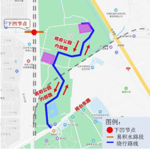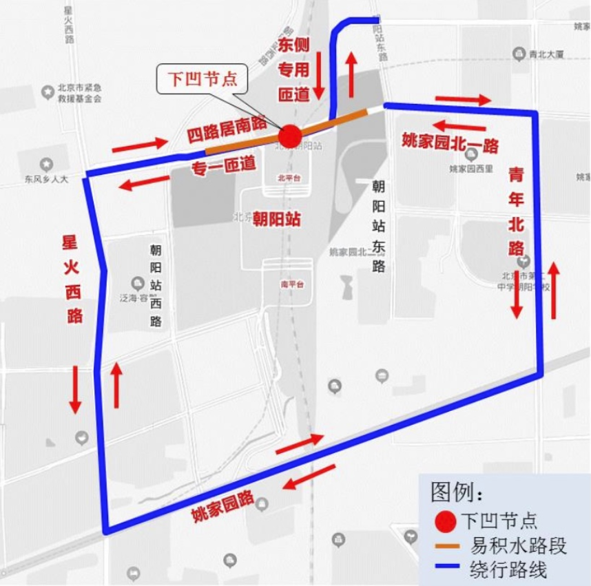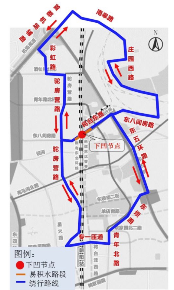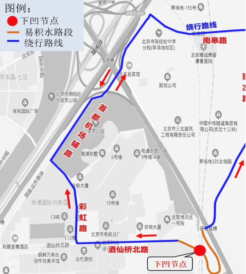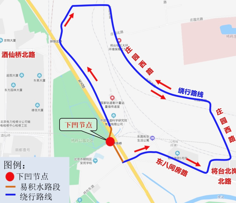 经前期梳理排查,京沈客专沿线相交道路四路居南路、酒仙桥北路、将台东路等下凹式立交节点,由于部分排水设施相对薄弱,易出现道路积水。为确保市民安全出行,朝阳区交通委员会经与相关单位研究,拟定了交通疏导路线,广大市民朋友可参照疏导路线通行。