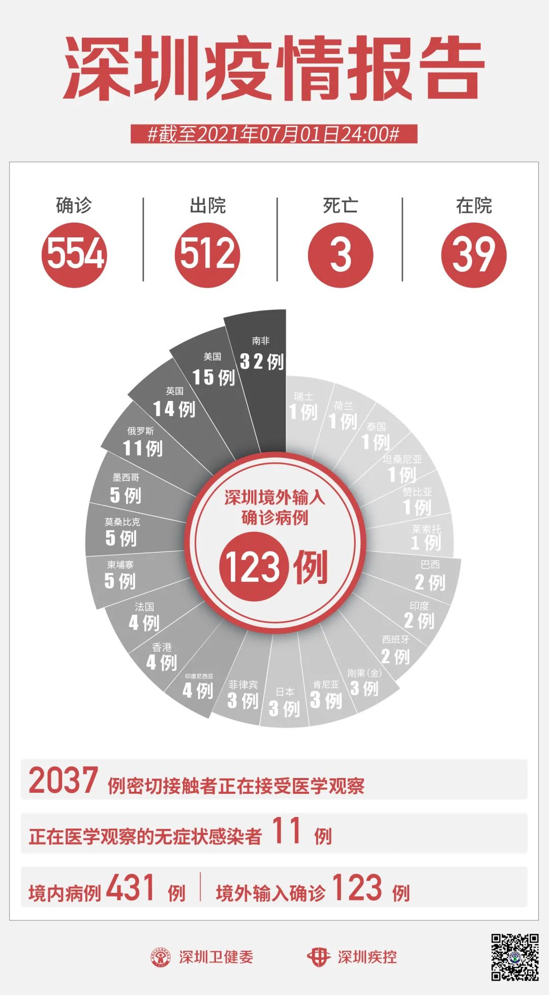 截至7月1日24时,深圳市累计报告新冠肺炎确诊病例554例。
