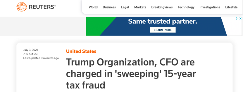当地时间6月30日,美国纽约曼哈顿地方检察官召集的陪审团对特朗普集团及其财务总监艾伦•维塞尔伯格提起刑事诉讼,诉讼可能与税务欺诈相关。据英国路透社报道,当地时间7月1日,检察官在法庭上披露了特朗普集团和维塞尔伯格涉嫌税务欺诈等多项罪名,但维塞尔伯格予以否认。