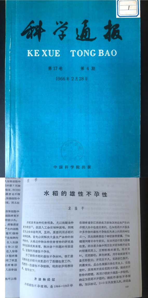 1966年2月28日,根据手稿整理成的论文《水稻的雄性不孕性》发表在《科学通报》期刊中,成为袁隆平“杂交水稻”设想的开篇之作。