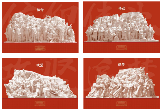 《信仰》《伟业》《攻坚》《追梦》四组大型雕塑位于中国共产党历史展览馆西侧广场上。276个人物与583块汉白玉融为一体,人势与山势相依,庄重、巍然,讲述着中国共产党一百年来为人民谋幸福、为民族谋复兴的奋斗历程。