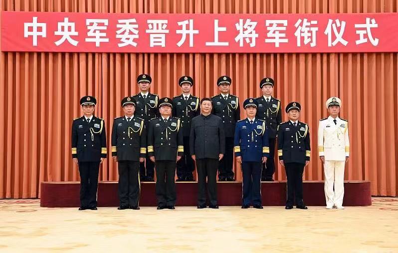 晋衔仪式在嘹亮的军歌声中结束。随后,习近平等领导同志同晋升上将军衔的军官合影。