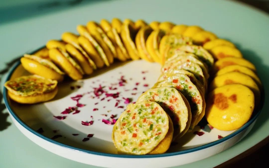 玉米饼配臭豆腐鸡蛋饼,鸡蛋饼里还有青红椒,好吃好看。