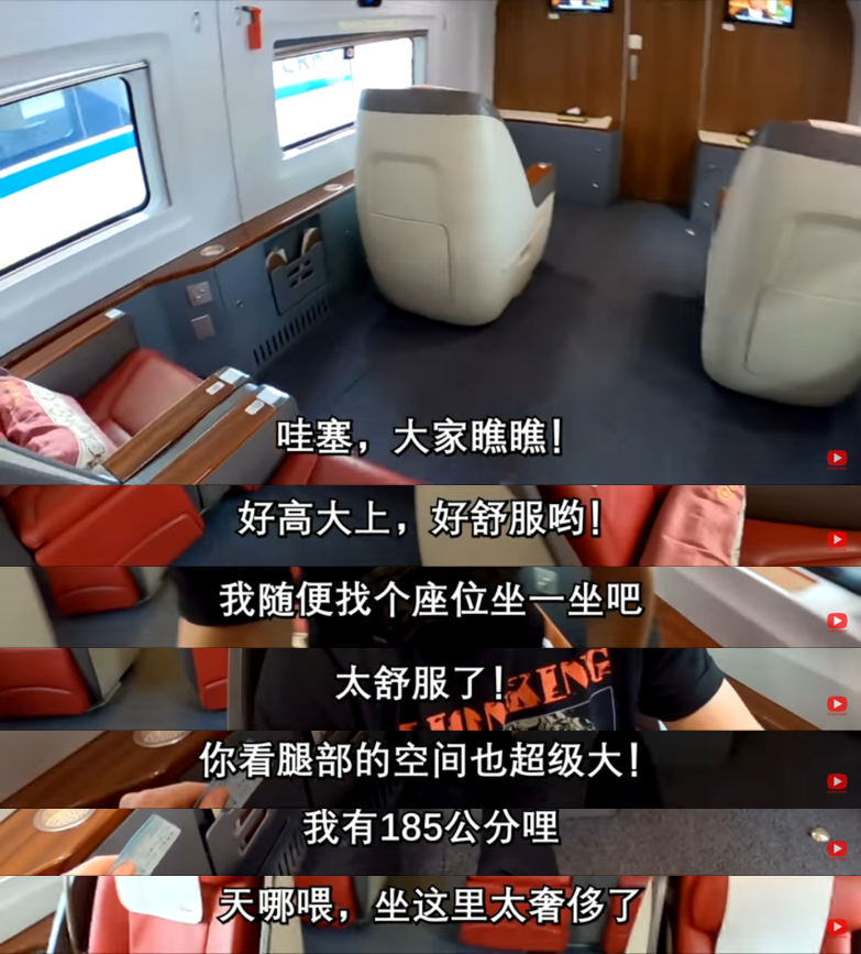 他看到座位后先是说“哇塞!大家看看,感觉好高大上,好舒服!”坐下以后,他表示,“这座位也太宽敞了吧!”随后,他展示了腿部的空间,说“你看腿部的空间也超级大!顺便说句,我身高有185呢。”他还表示,“坐在这里真是太奢侈了!”