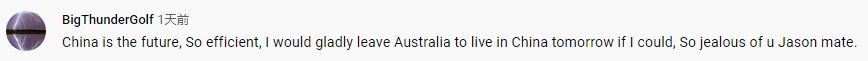 “中国是未来,效率真高,如果可以的话,我很乐意明天就离开澳大利亚去中国生活,真羡慕你,杰森。”
