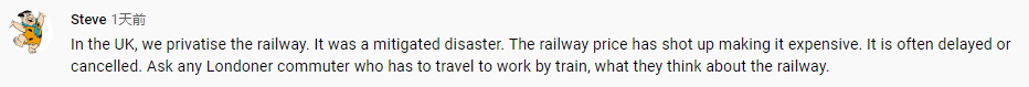 “在英国,我们的铁路是私有化的。这是一场被低估的灾难。铁路价格飞涨,变得昂贵。它经常被推迟或取消。问问任何一个不得不乘火车上班的伦敦人,他们对铁路有什么看法。”