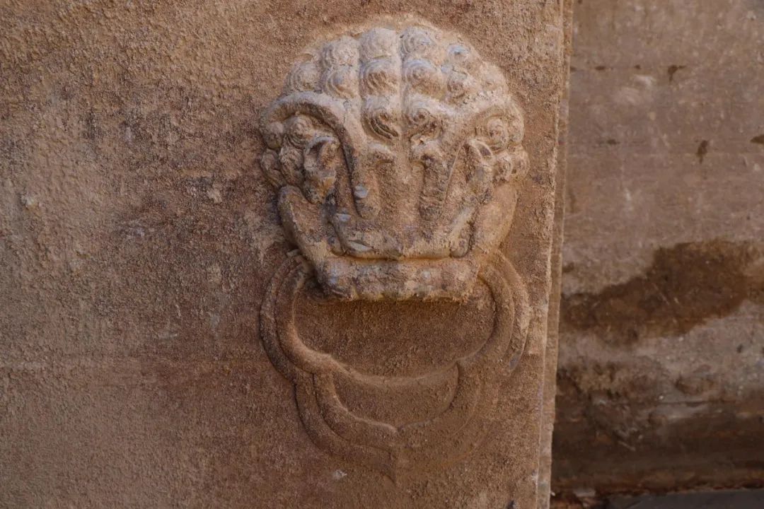 石门位于墓室南部,两扇石门中部均有一辅首衔环,高浮雕兽首,狮头、龙角、獠牙,口下衔浅浮雕门环。石门西面一扇呈开启状,门内有顶门石一块,已不在原位。石门以南为门洞券。门洞券高2.6米,为半圆形石券顶。石门门轴以上、门洞券上部的门楼等已经不存。挡券墙厚1米,残高3.2米,横砖错缝平砌,中部拆开痕迹明显,显然经过二次砌筑。