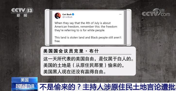 福克斯新闻台主持人杰西·沃特斯之所以这么说,是因为在7月4日美国独立日当天,美国国会议员、非洲裔社会活动家克里·布什发布了一条推文,她写道:“这一天所代表的美国自由,是仅属于白人的。美国的土地是从原住民那里偷来的,美国黑人现在还没有赢得自由。”