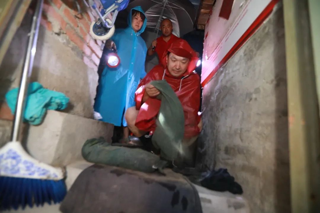 阜内大街332号一居民家下沉达1米多,社工调拨沙袋,进行填堵。