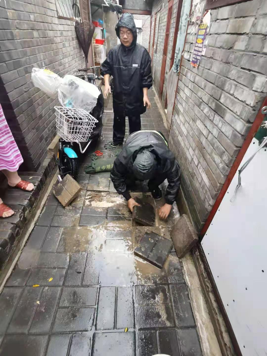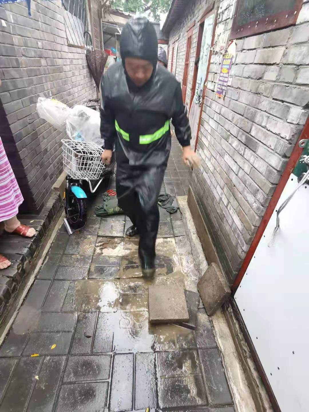 一夜大雨,7月12日清晨,西城区北顺社区西廊下胡同61号院内路面突然塌陷,前来巡查雨情的北顺社区党支部书记陈海洋发现后,一边紧急联络抢险部门,一边冒着大雨徒手扒土,第一时间先将坑洞填平了。