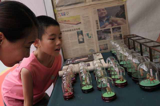 弓箭、核雕、苗绣、皮影、北京料器、琉璃烧、潭柘紫石砚雕刻、鼻烟壶、唐卡、紫砂、毛猴、砖雕……潘家园市场近年来一直大力推广非遗,通过在市场内打造非遗文化街区、对非遗商户进行优惠扶持、举办非遗文化节等多种方式,发扬非遗文化,传承非遗技艺,让非遗在潘家园“活起来、动起来”。每年一度的潘家园非物质文化遗产手工艺品交易博览会至今也已延续十三届。