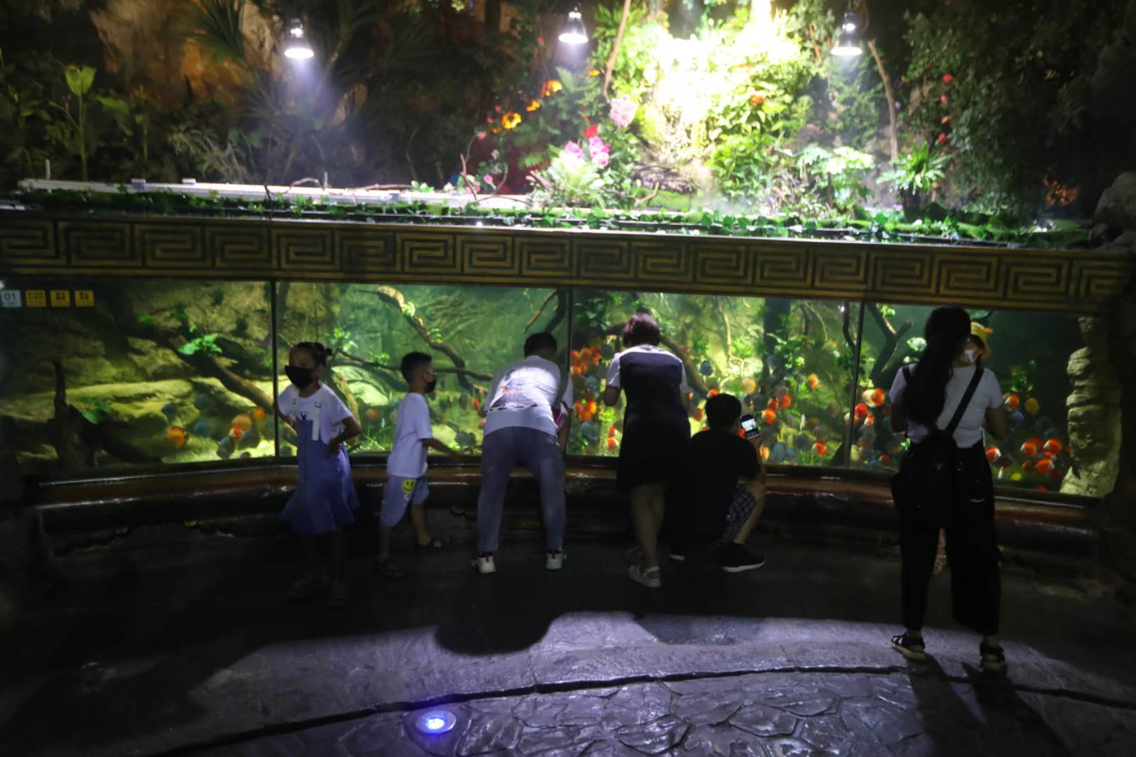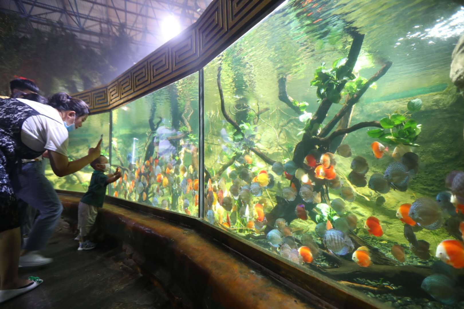 在生态缸内,游客可以看到陆生类、藤蔓类和附生类植物,七彩神仙鱼在植物中自在游弋。“七彩神仙鱼对生存环境的要求非常高,而我们通过模拟热带雨林环境,为它营造了酸碱平衡、含氧量高的生态系统。”王喆琛说,“别看缸底泡着沉木,它不是装饰,浸泡过程中产生的木质素,正好能调节水中酸碱平衡度,为水中生物创造弱酸性软水环境。”
